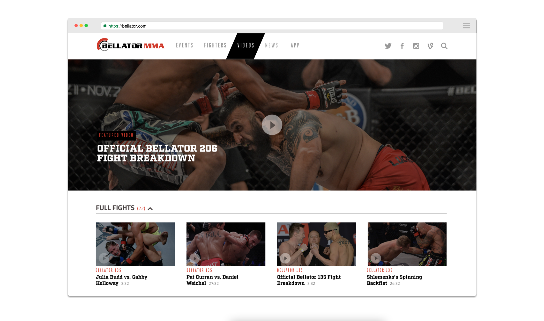 The site would surface a larger archive of fighters across the Bellator universe that included Women fighters alongside the men. Each fighter included a full fight history and fighter highlights. The idea was that a fan could research a fighter and always be a step away from watching them in action.