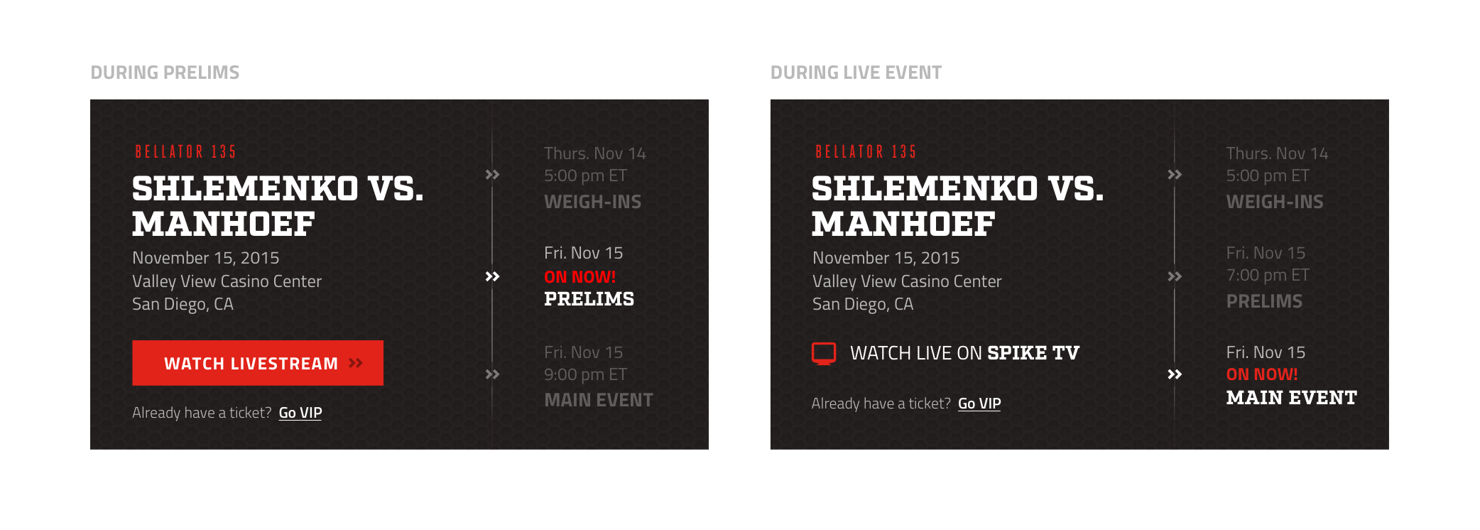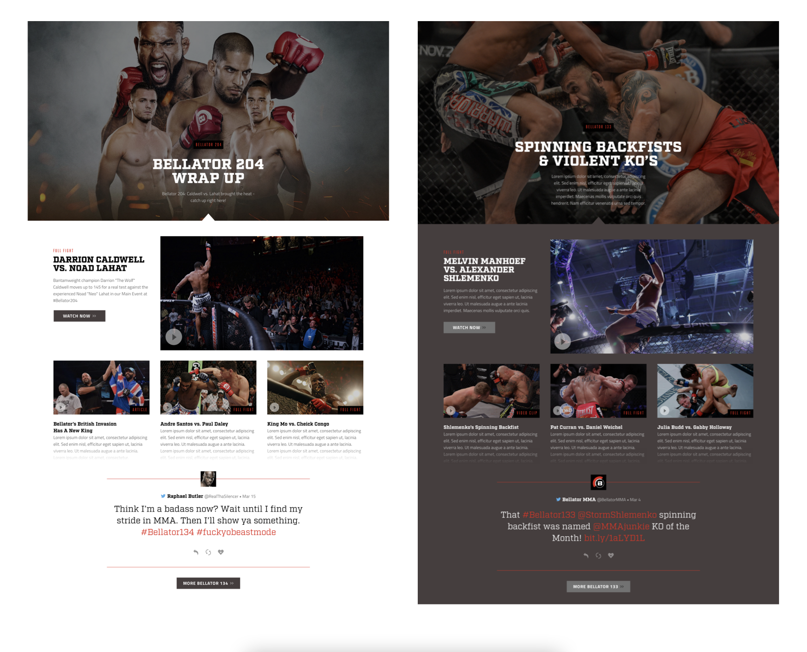 A strip under the hero would feature a countdown to the next Bellator even to increase fan anticipation. As you scrolled down the homepage you would see high quality artwork associated to each featured event.