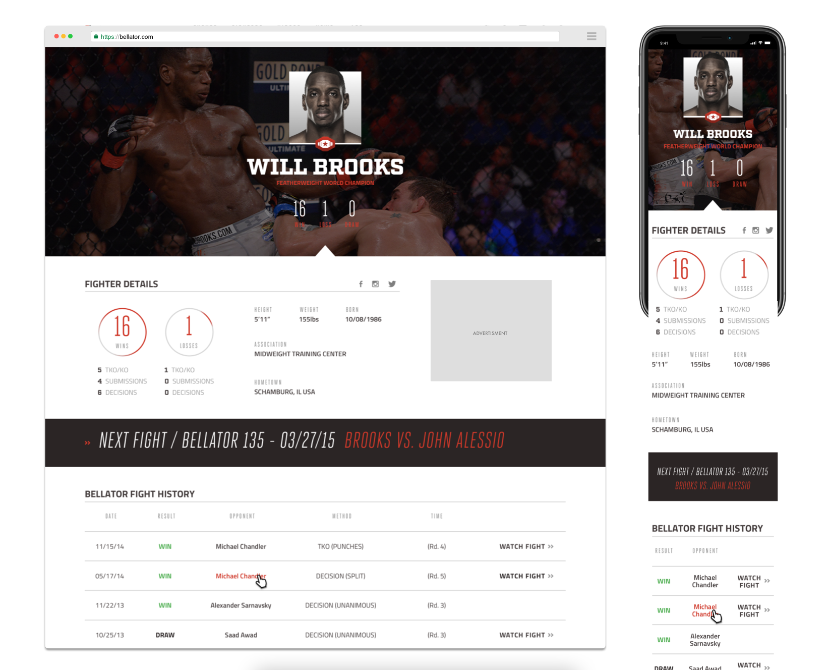 The Bellator site increased usability across a wide range of modern devices. Previous to the new design the site offered a sub-par experience on mobile and tablet devices.