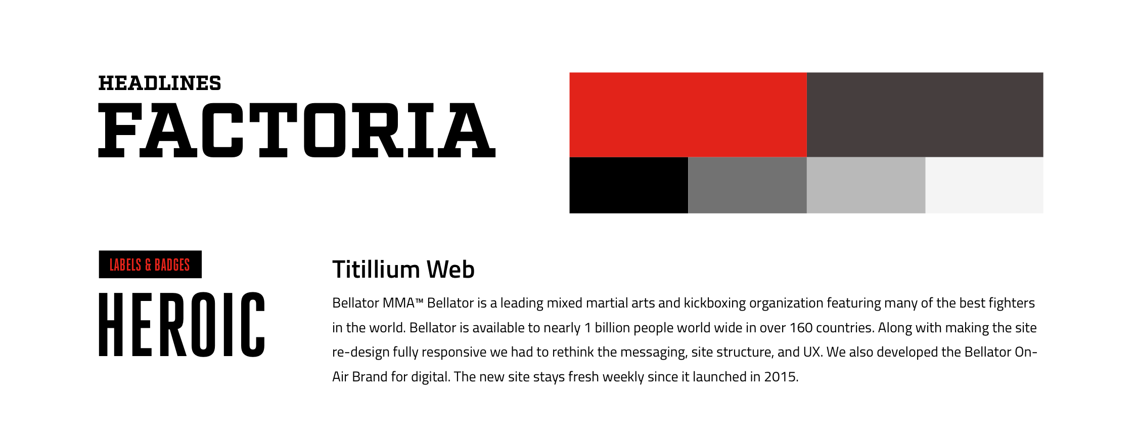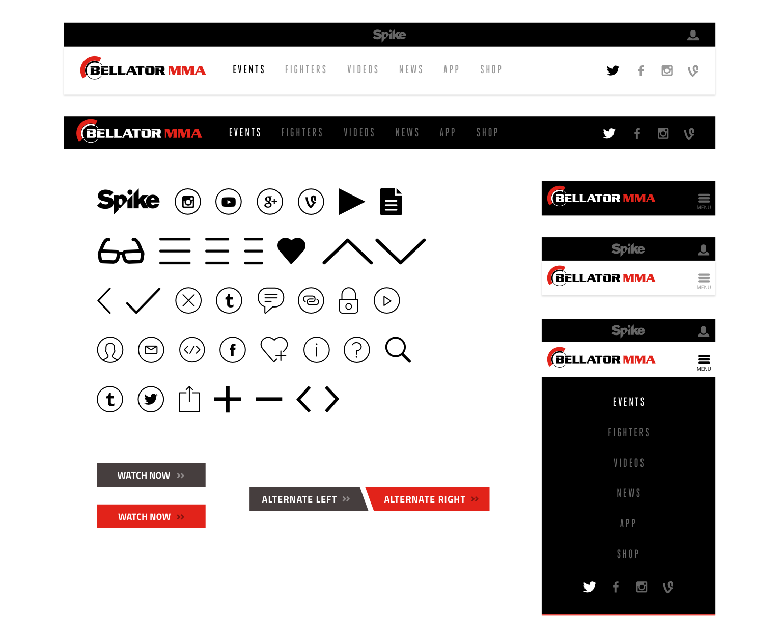 We worked with the Bellator brand design team to update and interpret a mostly print based system into the digital space. We built one of the first design systems for our team that included web safe fonts, and colors, SVG iconography.