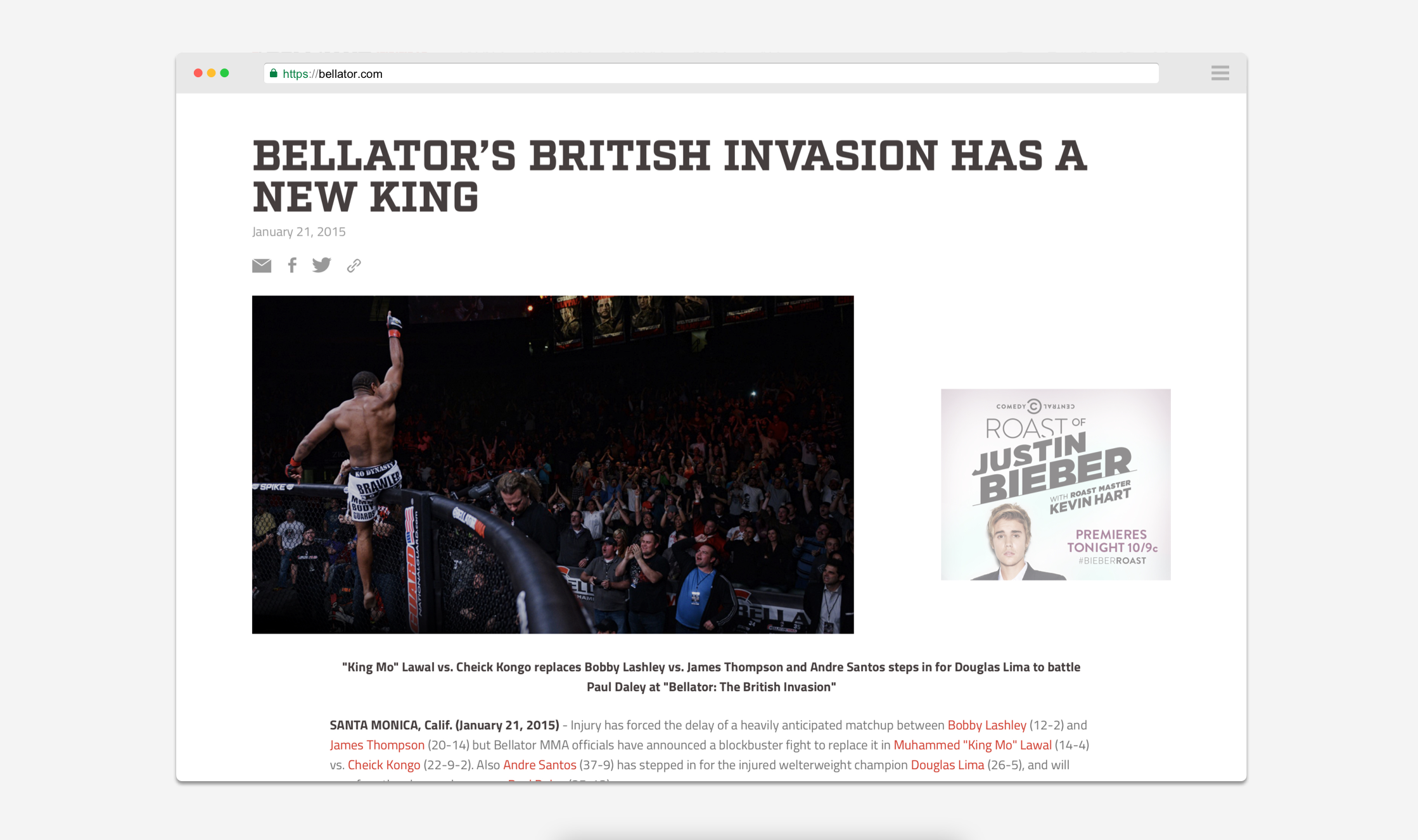 Along with making the site re-design fully responsive we had to rethink the messaging, site structure, and UX. We also developed the Bellator On-Air Brand for digital. The new site stays fresh weekly since it launched in 2015.